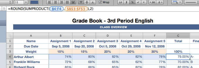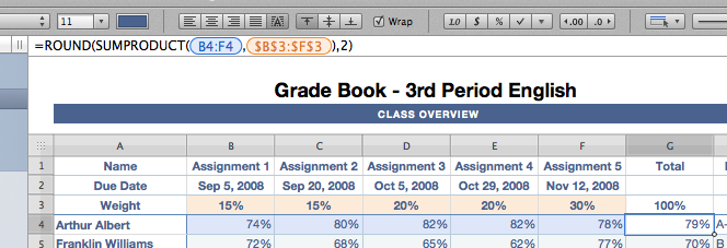 The original formula in G5 was this: =ROUND(SUMPRODUCT(B5:F5,$B$3:$F$3),2)
