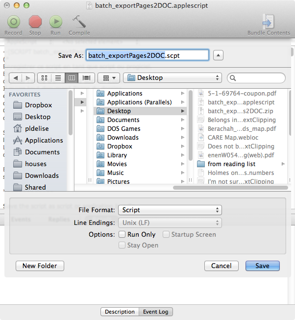 This means that once the script opens in Script Editor go to File & Save As… then choose Script or Application Bundle from the File Format drop-down menu. I prefer Script, but try both if you'd like.