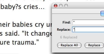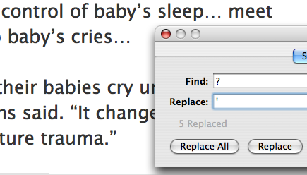 I have a manuscript I got off the Internet that has a bunch of isn?t's and wasn?t's and the like—due, I assume, to some miscommunication between MS Word's automatic curly quotes and the ASCII limits of ISO Latin 1. I tried doing a find-and-replace to put typographic apostrophes in place of the question marks. Pages found the question marks and put typewriter apostrophes in place of them, though I'd carefully entered a typographical apostrophe ((opt-shift-]) in the Replace field. So I tried again, to replace the typewriter apostrophes with typographical apostrophes. Pages now replaced the few typographical apostrophes I'd manually entered with typewriter apostrophes. Well, at least it's consistent. So far as Pages, Apple's flagship word-processing/page-layout app is concerned, there's apparently no such thing as a typographical apostrophe—something that was understood, as I recall, by the original MacWrite 25 years ago. So do I have to go back to doing all my editing in TextEdit (which seems to be much better at text work than Pages), or can somebody tell me how to persuade Pages to take care of this trifling little task correctly?