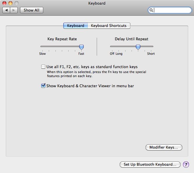 For example: when I press F8, iTunes will stop/start playing. When I press F10, the volume is muted. And I want to have these functions accessible only when pressing Fn + F8 or Fn + F10. Above mentioned procedure says: Go to Keyboard preferences and Enable "Use all F1, F2, etc. keys as standard function keys.". But there is no "Use all F1, F2, etc. keys as standard function keys." option in Keyboard preferences any more so I cannot enable it.