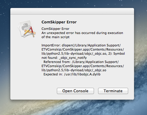This has to do with some Python version error on your system. It's tricky to troubleshoot unless your sitting at your box, but I'll give some background and a few pointers. ETVComskip comes with its very own Python executable, so you shouldn't even be seeing this error. Emphasis on "should." The upside should be that ETVComskip is robust to changes in Apple and Macports Python versions. I don't know why or if ETVComskip's Python should be calling the system library in /usr/lib.