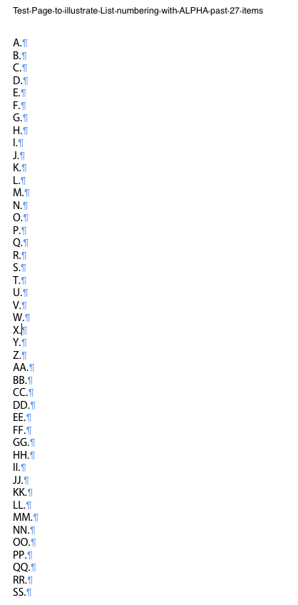 There seems to be a problem using Ordered Alphabetic lists in pages past 26 items in Pages 4.1 (build 923). Has anyone else seen this? Attaching a screen shot of the issue. If you have double letters in your list after Z items (26) it goes to AA, then BB,CC,DD,EE.