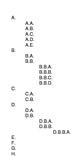 I see what you mean. However, if you consider indenting, making a new order of the list (for the indented items) that might logically flow and it would by virtue of the period be somewhat obvious that this was a subcategorization. It's probably not the best way of tiering (possibly another issue, or shortcoming of tiered lists?). Not that relevant to my complaint / problem.