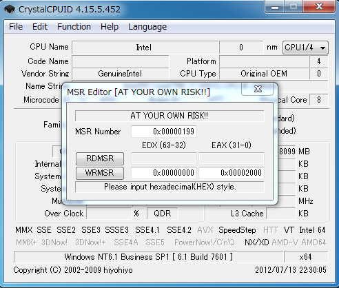 As a temporary workaround, in the application of the Throttle Stop, but it was confirmed that Turobo Boost working effectively, then, I tried to examine the state of the MSR at the before and after application of the Throttle Stop.