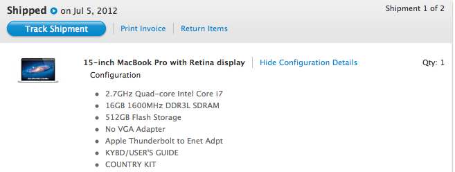 So I put in an order for a retina Macbook Pro on June 17 and as we all know the estimated time to ship is 3-4 weeks right now.