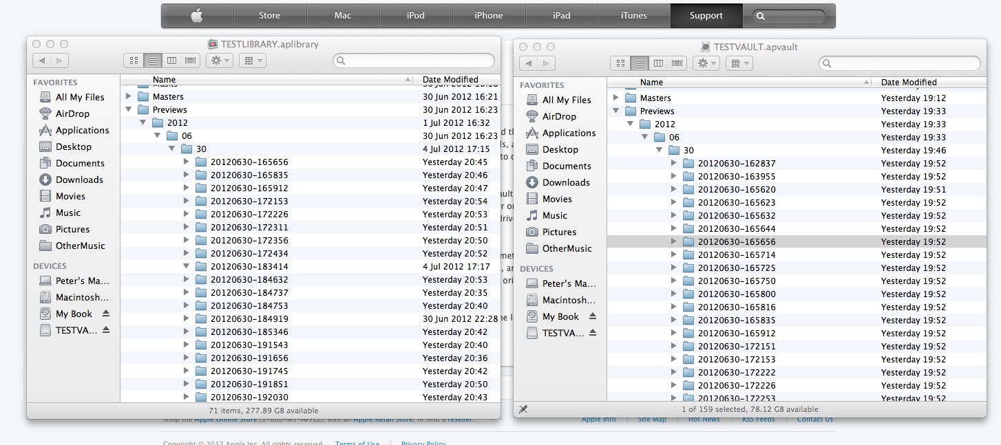 If you look at the highlighted line in the vault it corresponds to the top line in the library, so all the folders above that are previews that are in vault but not library. There are others further down that are vault only folders. In terms of size the additional lines in vault add up to 20 GBytes whereas the folders common to both total less than 18 MBytes on both sides.