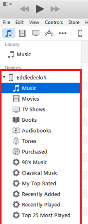 Enable the side bar with CMD+S then expand the contents of the device in the sidebar so that you can see the playlists within it.