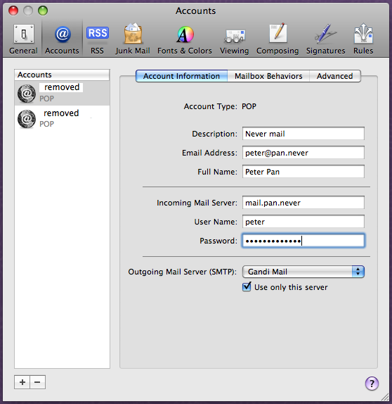 Below you will see typical POP settings for Mail. You may not have to change SMTP settings if you are staying with the same provider. Thunderbird settings can be seen at: http://links.zero.eu.org/thunderbird/images.html#b