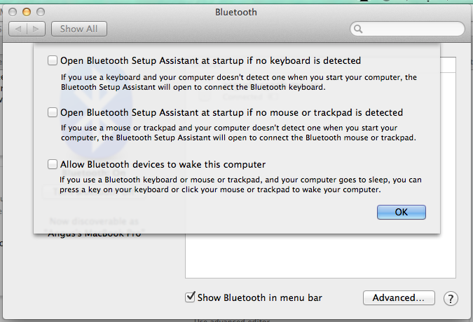 I kept up my interest in the 'wifi/bluetooth' saga yesterday and came across a thread that disabled the advanced settings in the 'Bluetooth' preferences shown below: