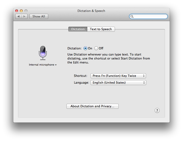 On the MacBook, a double press of the Fn key brings up the mic. The system appears to register my voice but fails to translate (the 3 purple dots blinks and then shakes without a result).