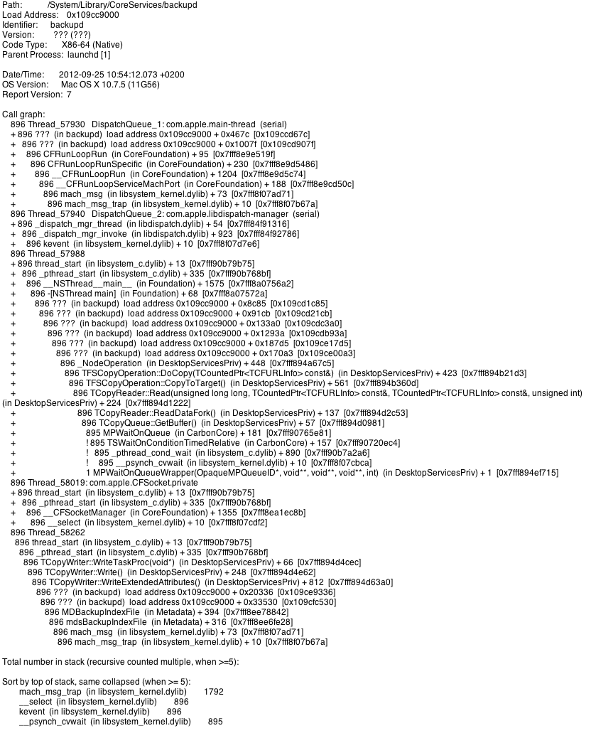 Sorry for the trace picture, although the only scope was to somehow prove that "backupd" seems stucked into a TCP communication part of the stack and NOT in waiting filesystems lock release situation which would have resulted from bad interaction with SpotLight indexing or other programs (problem injected since 10.7.5 because was warking perfectly and FAST till 10.7.4).