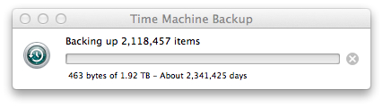 Did a backup with the program that came with my hard drive in a very reasonable amount of time. 200gb in 5 hours. Now I am attempting to do another backup with TM.. I have 20.58GB out of 234GB with "About 3 days" left and it's been running for 7 hours! Someone needs to fix this ASAP.