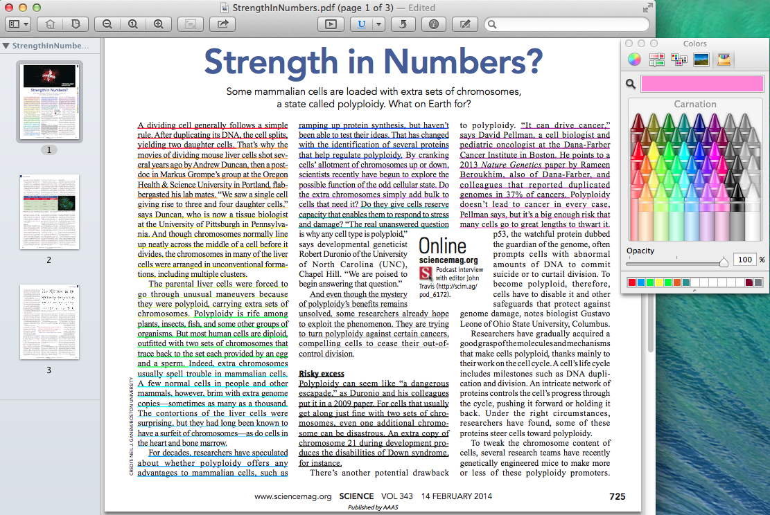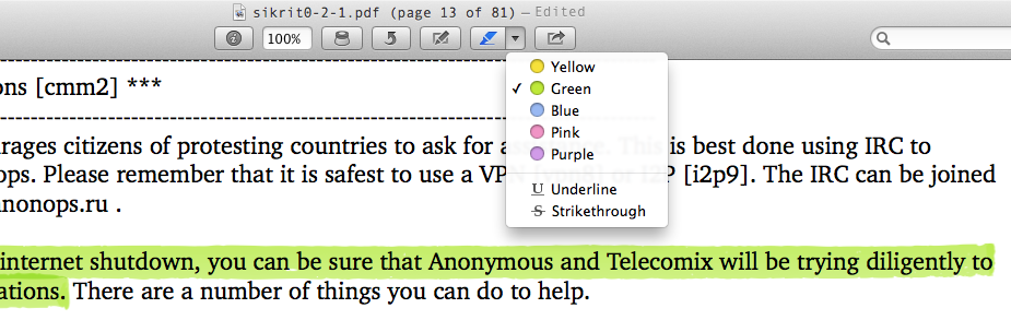 If everything goes well, the execution of the macro (again via KM) will open the small empty PDF file you saved on the desktop, and follow some crazy color picking steps. Don't interrupt the sequence: it will take only a few seconds. Once the sequence is over, you will see an open color picker box. From then on, you can open your own PDF file and select the underline (Command Control U) and select whatever color you want in the color picker and use it for your underlines. You can change to a Highlighter and return to the Underline and the color picker will still function. I have attached a sample screen capture with dizzying underlines: see below.