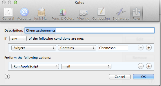 I did a search on scripts working manually but not automatically and found some clues, but no answers. The frustrating thing is that it seems that the script is ok, but Mail isn't using it automatically. One thing I found was to save the script as a bundle, but that doesn't seem to work anymore.