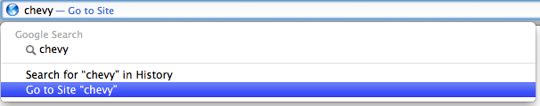 Example, I want to go to http://www.chevrolet.com but I've never been there before, so it's not in my history or bookmarks. I don't know if it's chevy or chevrolet, but I'm positive the site exists and I expect my browser to take me there. I type "chevy" in the address bar. If I hit [enter] on the new Safari 6.0, it will take me to a page with Google search results. But if I look at the drop down list that appears and choose "Go to site "chevy"", it will do what the old Safari used to do with less effort. Voila! It was chevrolet.com but I'm there in one click without ever visiting Google.