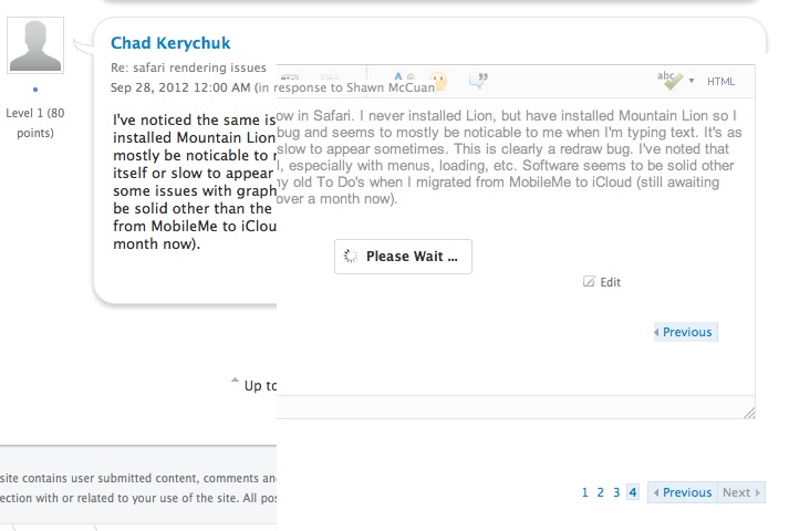 I have been getting some strange rendering issues since upgrading to OSX Mountain Lion/Safari 6. They seem to be fairly random, and happen accross multiple sites, even "big sites" like YouTube. I will get "artifacts" left behind, and I'm even getting them now as I'm typing this message with the text. Because is seems to be so "random" I have no idea what's causing it, but, it's very distracting and obnoxious when the artifacts interfere with navigation. Is anyone else experiencing these problems?