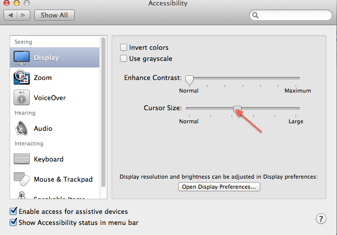 Is there a way to change the mouse pointer size, in Mountain Lion? I've looked all over and can't find it. These old eyes of mine need a big pointer. If not, is there a third party software that will get it done?