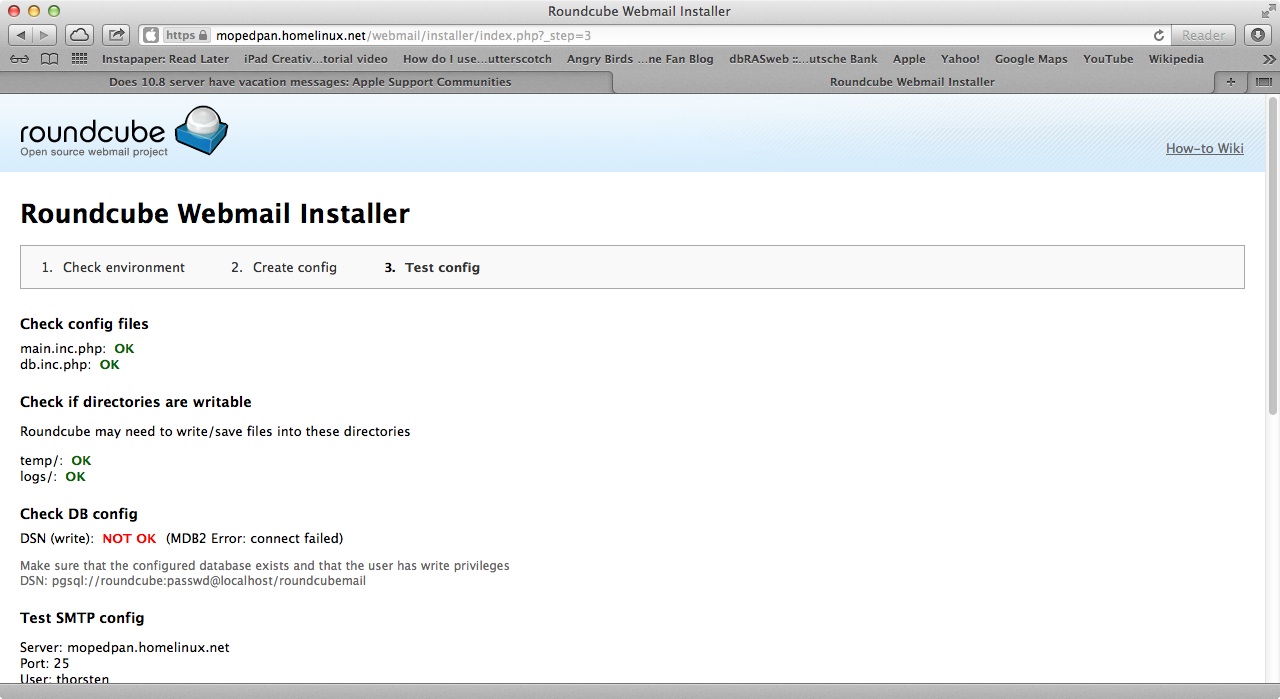 $rcmail_config['log_driver'] = 'syslog'; (This means that your error messages will turn up in your system log - the next line or two down identifies the log id as "roundcube")