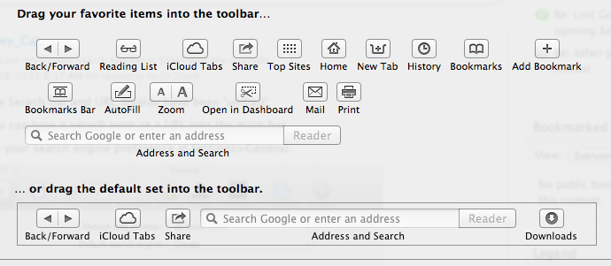 Lost my Google search toolbar in Safari with the upgrade to Mountain Lion. Tried View/Show Tool bar. No luck, did not not reappear. Tried customize Tool bar. Found it, but I can not drag it to the tool bar next to the internet address page. As I dragged it to where I wanted it (the same place as before; next to the internet addess line) I never got the little green plus sign to drop it into place. Help please.