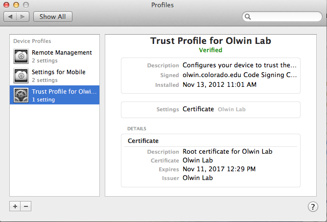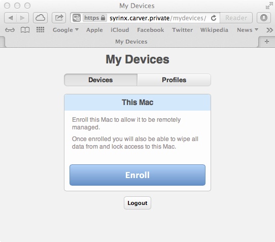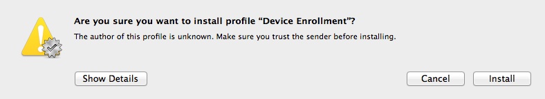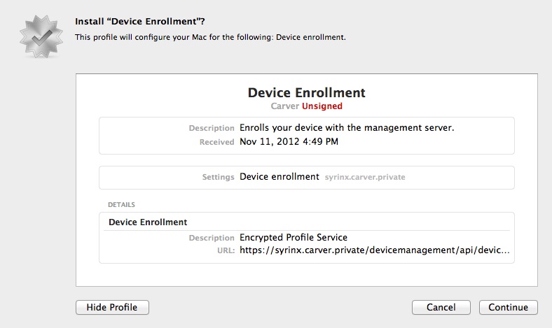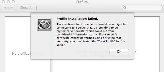 Prior to installing the Device Enrollment Profile you need to install a Trust Profile. In the My Devices window there is a Devices and Profiles. Click on Profiles and install the Trust Profile. If you do not have one you need to return to the Server app and select Review Certificates. In the Certificates panel you can create a self-signed certificate.