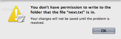 When you don't leave a TextEdit file in a changed, but unsaved, state you'll never see the error message... at least I haven't.