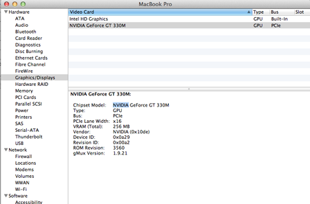 Graphics: NVIDIA GeForce GT 330M, NVIDIA GeForce GT 330M, PCIe, 256 MB
