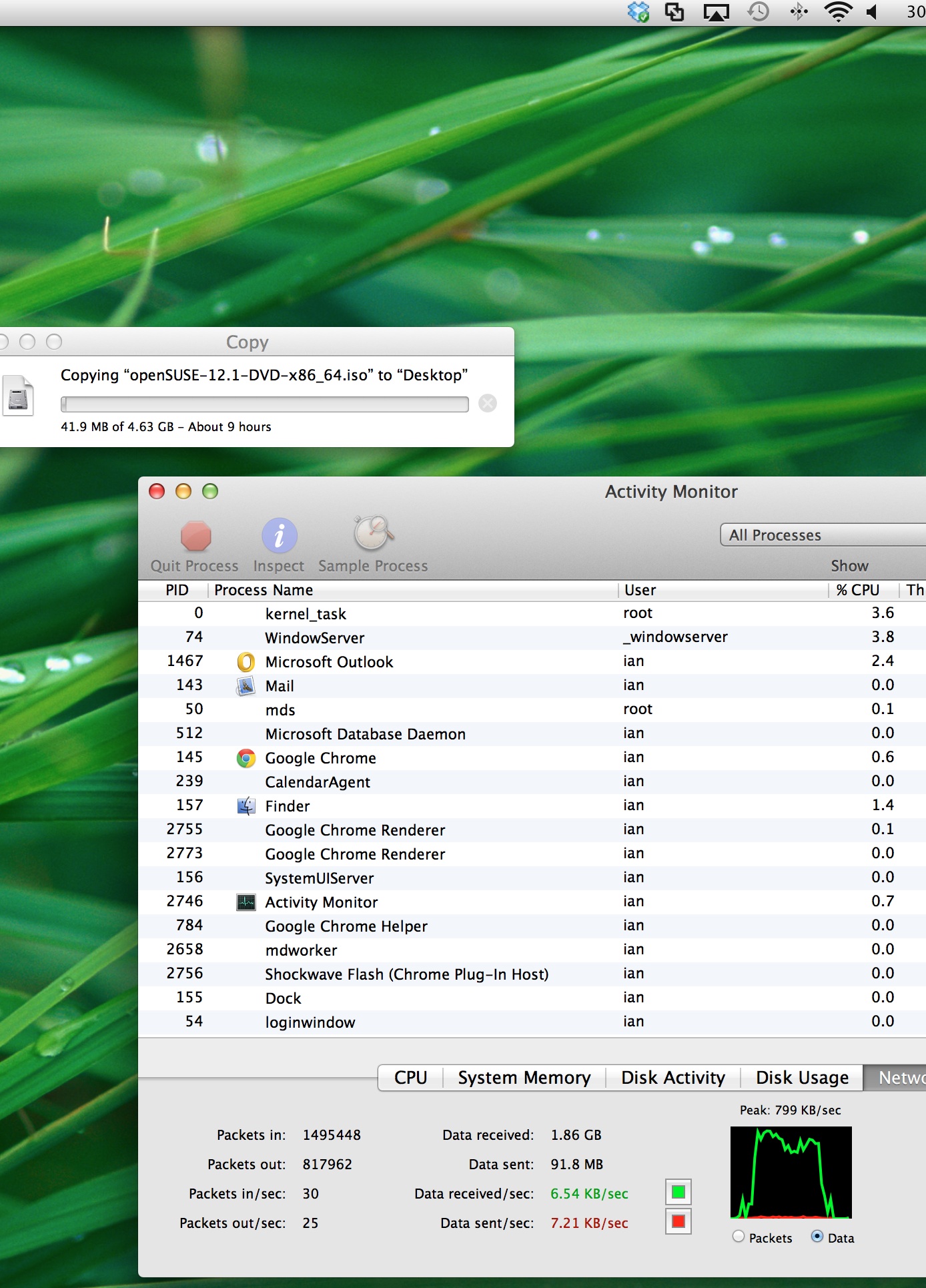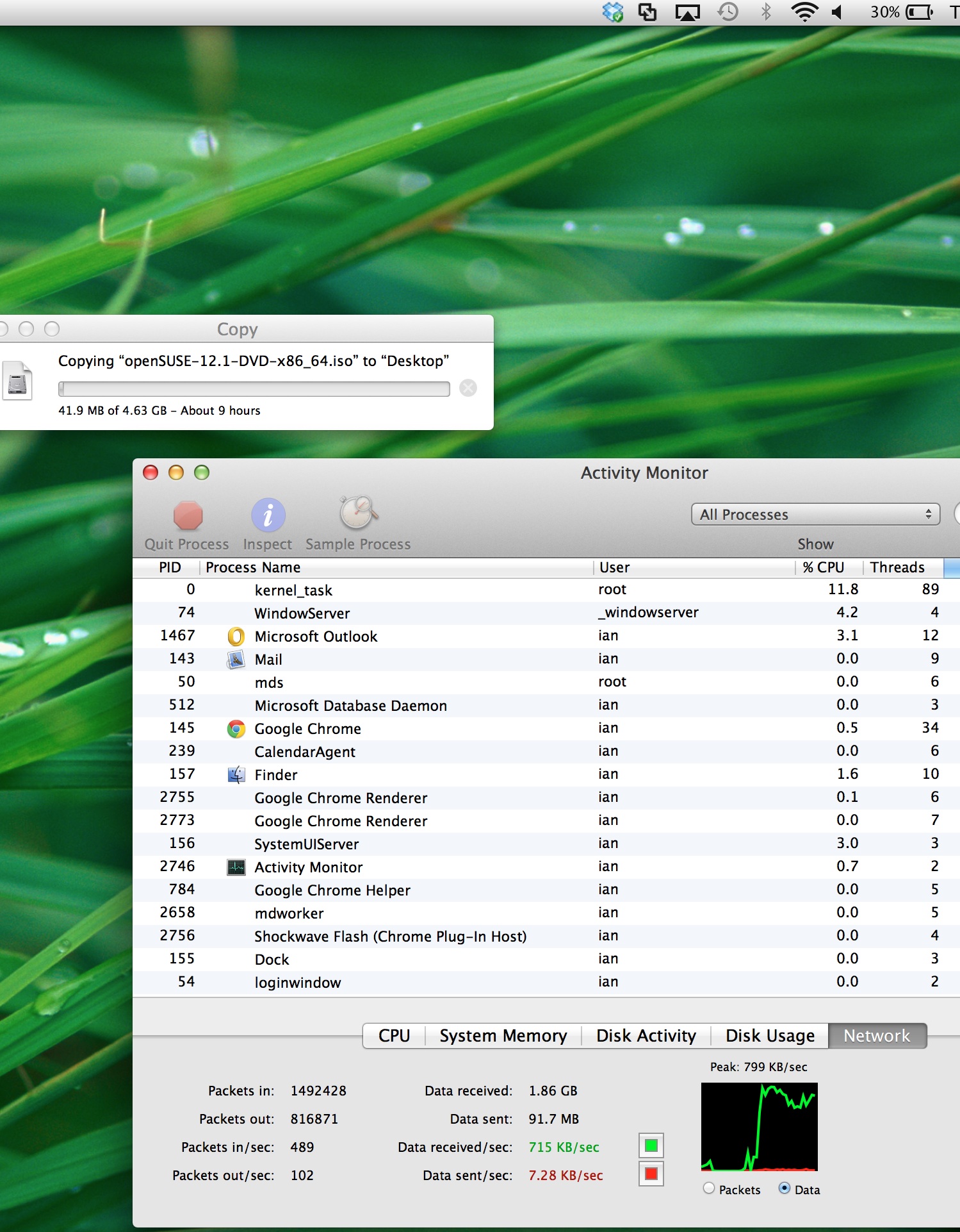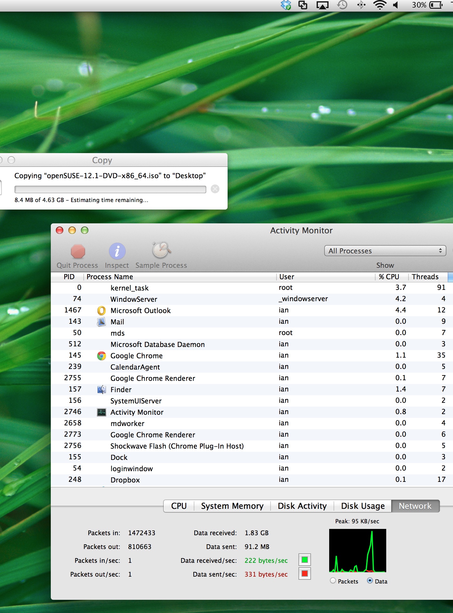 Attached are some screen shots whilst trying to copy an iso across the network... it seems that when bluetooth is on and with something connected to it (mighty mouse in my case) you can hardly get any packets through the wifi... I wasnt even able to do a google search to remind myself on how to take a screen shot.