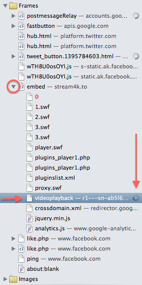 2. When you have a video playing or loading on a Safari page, hit ⌥⌘A or pull down “Show Page Resources” from the Develop menu. The geeky, convoluted “Web Inspector” window opens.