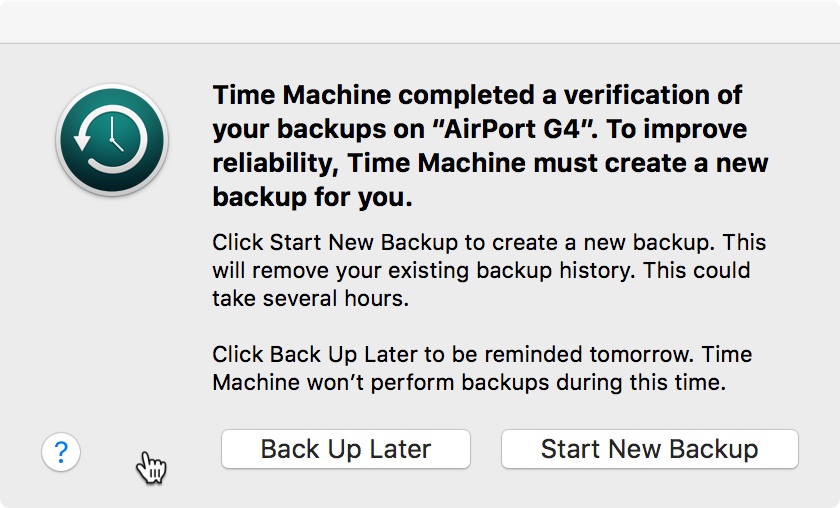 Time Machine completed a verification of your backups. To improve reliability, Time Machine must create a new backup for you.