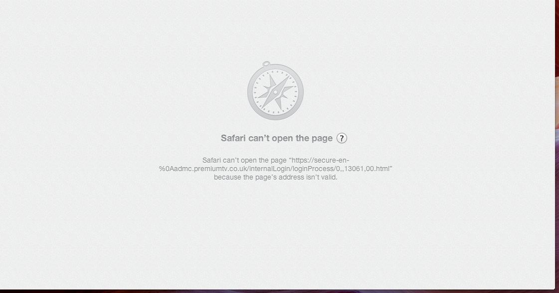 "Safari can't open the page https://secure-en-%0aadmc.premiumtv.co.uk/internalLogin/loginProcess/0,,13061,00 .html because the page address is invalid"