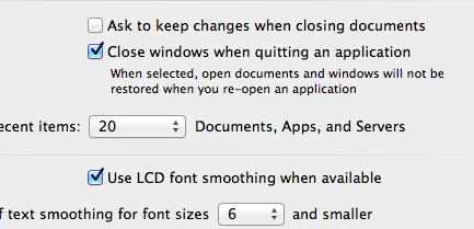 You can also keep your previous session’s documents from coming back to haunt you every time you start an application. Open System Preferences and click on General. In the Number Of Recent Items section, uncheck Restore Windows When Quitting And Re-Opening Apps.