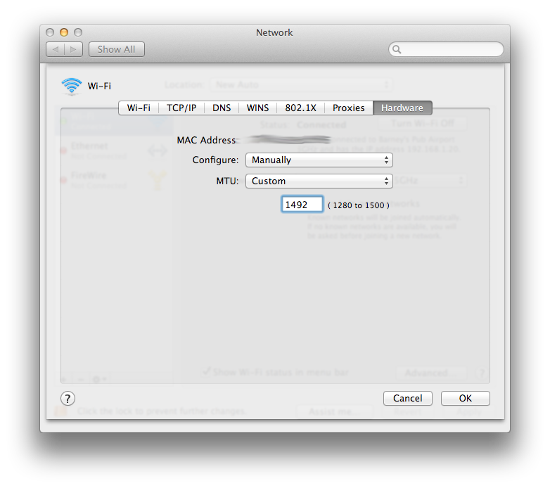 I had seen on some other posts where people fixed some networking problems by lowering the Maximum Transmission Unit (MTU). Long ago, there used to be a problem where OS X wouldn't connect with the standard of 1500 and it had to be reduced. I can't remember the number to use, but 1492 sounds familiar (could just be the year Columbus sailed the ocean blue).