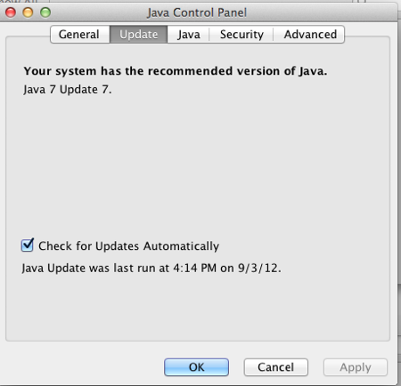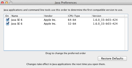 Java Preferences in Utilities has been updated from java version "1.6.0_33" to Java SE 6 to 1.6.0_35-b10-428 while Java from Oracle remains the same as above.