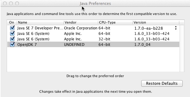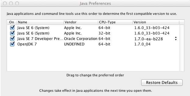 Yes, it is all as you suggested after installing the JDK as opposed to the JRE in Java Preferences. By that do you mean which version is reported upon the "java -version" minus the quotes command? If v6 is on top it shows in Terminal and if v7 is on top it is what reports upon the "java -version" minus the quotes command?