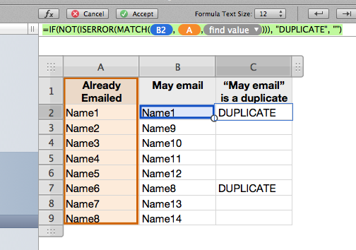 Column A is a list of email addresses for people I have already written. Column B is a list of email addresses for people I would like to contact. I am not sure if there are email address from Column A in Column B, but there may be and if there are, I must find out so that I don't send a second email to these recipients. How can I have Numbers look at both columns and tell me which email addresses in Column B are not in Column A?
