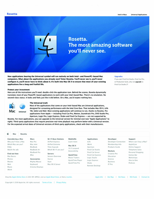 Rather than make its users replace all of their current PPC software, Apple licensed technology from a third party company that transparently emulated the PPC routines on the new Intel Macs; Apple named it Rosetta. It was a minor miracle: customers could continue to run their software libraries (for the most part) and yet purchase new software that ran native in Intel.