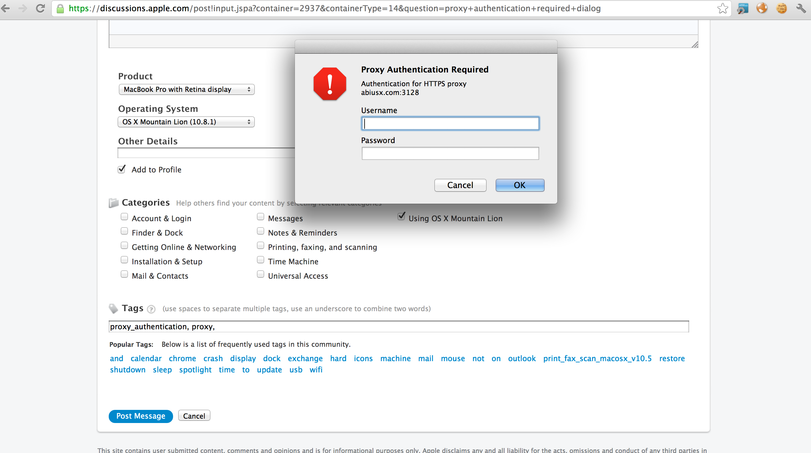 But under both 10.8 and in particular 10.9 whenever a proxy is in use, the user gets bombarded with multiple recurrent proxy authentication dialogs without any save options and without any identifier.