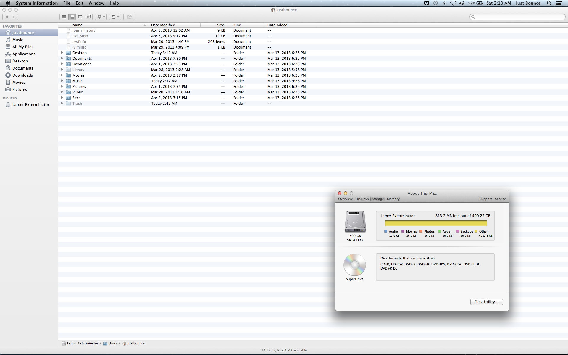 1st trip to the Apple Genius Bar, I was told everything checked out fine. The volume was verified via disk utility, and after poking around for sometime he said that perhaps “About This Mac” “Storage” tab was reporting faulty data and that I needed to reinstall MT Lion. If that did not work I was to “erase” my HD and perform a “recover” from Time Machine. For me, this was pretty drastic but went home and reinstalled MT Lion. This did not solve the issue so I stopped.