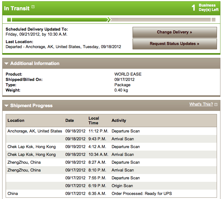 I'm so disturbed by this UPS thing. On the order page where you decide if you want it delivered, there was no indication of who would be doing the shipping this time (I looked, because I'm paranoid about this as it is). In my experience of ordering with Apple, they use FedEx or another carrier who delivers very early in the day, even to residential addresses.