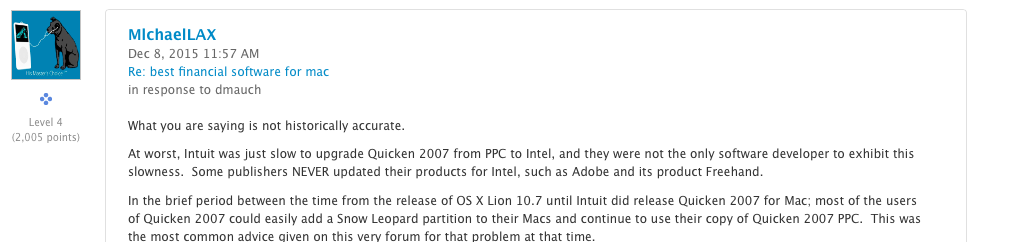 That being said, I will acknowledge your earlier statements that Intuit did indeed have over six years to update Quicken 2007 to an Intel or Universal version, which they chose not to do at that time. However, that time frame and your statements about other software publishers are misleading.
