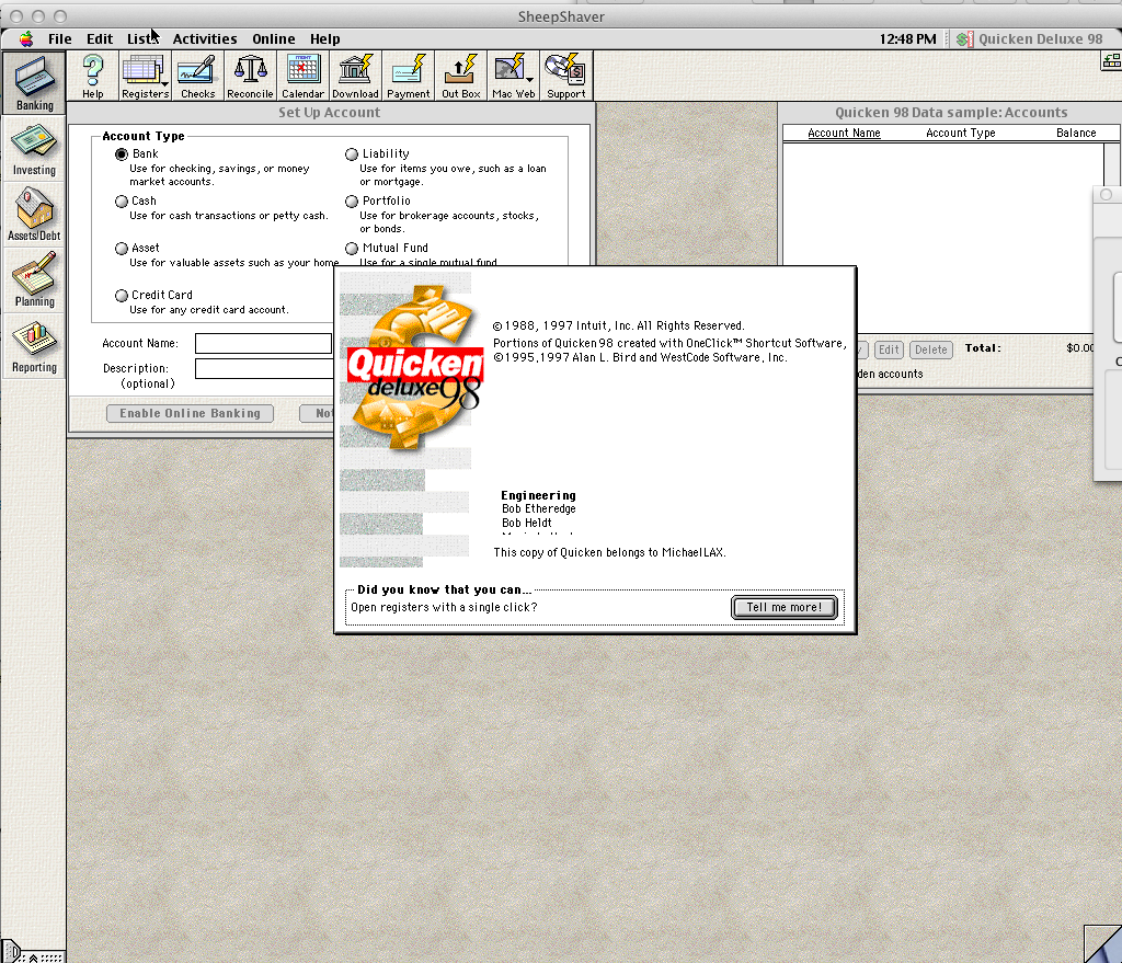 Here is Quicken '98 running in SheepShaver on my OS X Lion Mac Mini: