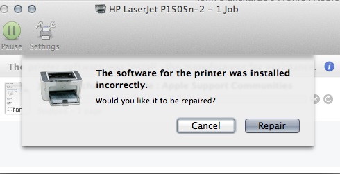 Repeated request to repair permissions on printer software for HP P1505N. After repair works ok. After reboot same thing happens
