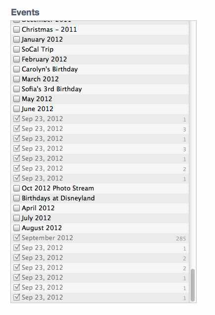 It is also very odd that it is spilting the made-up Sep 23, 2012 events. The only thing I can make of it is that my Sep 23, 2012 are my most recently imported camera pics (not from an iPhone or iPad). However, within iPhoto all these pics are within the September 2012 event folder.