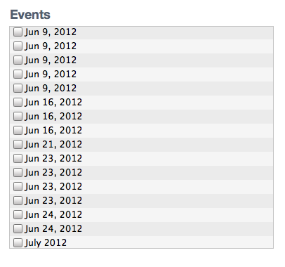 I never had this problem on 9.4 but now that I updated to 9.4.1 I have the duplicate events that seem to be derived from real events. The actual events in iPhoto from June-September are not showing up in iTunes at all yet some of the photos are in individual dated events. Below you will see my events for all of 2012 in iPhoto and the next shot will be hoe they actually show up in iTunes. The only way I can get these on my iOS device correctly is to set up a 2012 Album, put each event in it and then sync that album. At least I will have the proper events within an album. How the heck do I go back to 9.4?