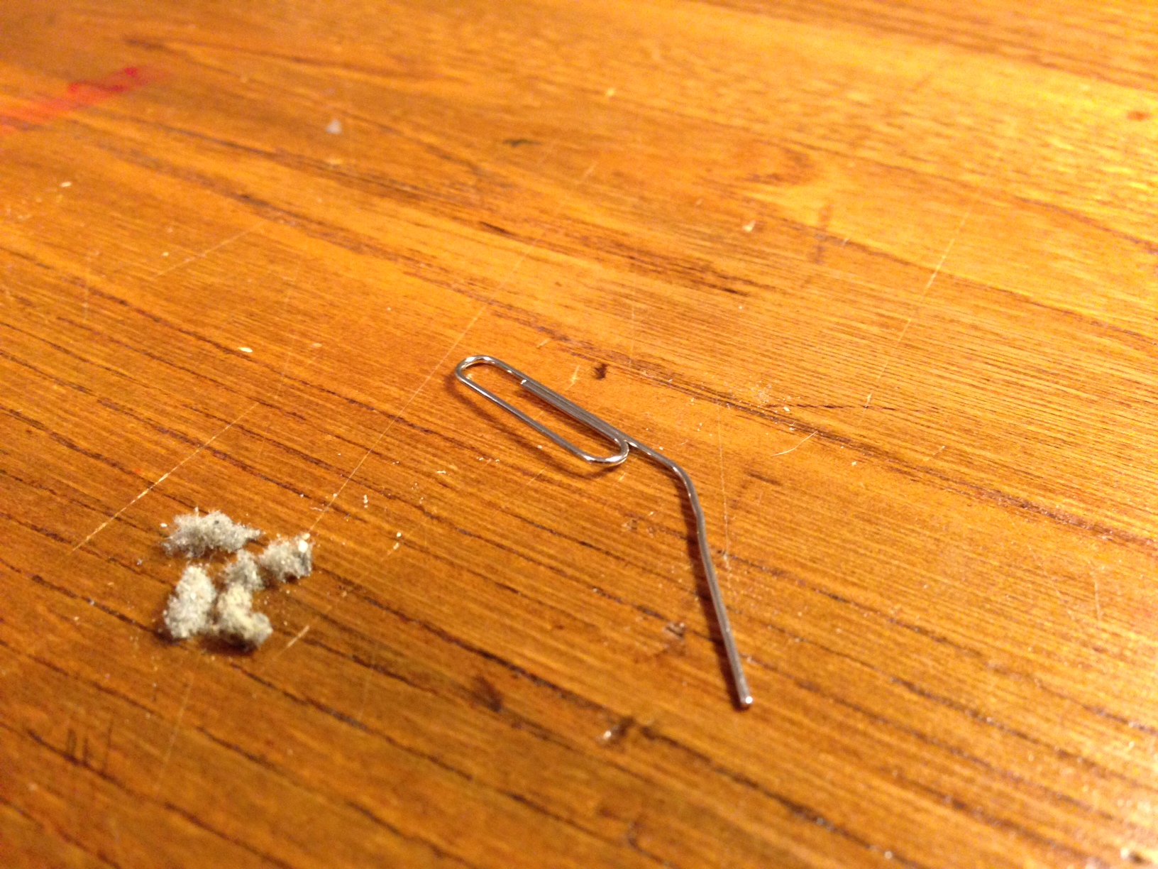 A paper clip doesn't not work the amount of times ive been told this probably by Apple employees, im not at all impressed. Ive had my iPhone 5 for awhile and for it to stop working Iv tried different chargers cleaning the port and nothing. Got the same response when I went to the Apple store thats its probably fluff. Not an offer to send off and repair it or any thing its quite clear it more than that. Theres no water damage it been in the case all the time and also how can it be fluff when ive always used the little rubber battery hole cover. There seen to be pages an pages of issues of the iPhone 5 not charging and it cant all be down to fluff