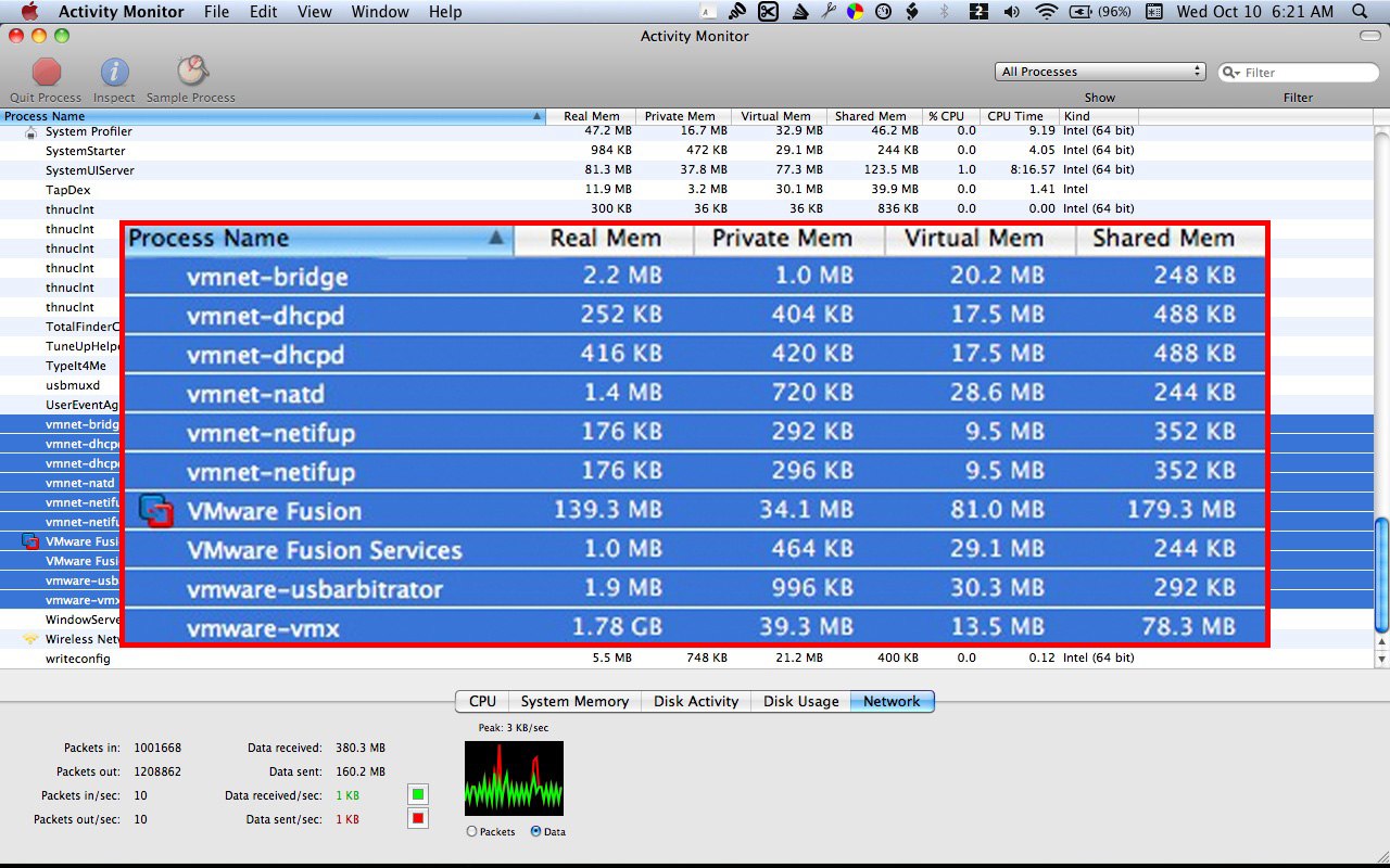 And in addition to the 60Gigs of static, unchangeable space it takes up on my Mac's SSD, it uses another quarter Gig or so of my SSD's free space for its virtual memory requirements (see the Activity Monitor screenshot below).