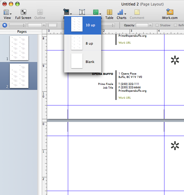 In Pages v3 (current version) there are six Business Card templates. I've checked only the first ("Classic Business Card") which offers the layout below: