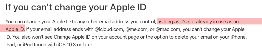 When I want to enter my iCloud email address (like foo@icloud.com) as my Apple ID, the system at appleid.apple.com tells me that I can't use an email address with a domain owned by Apple as my Apple ID which I find odd enough. I tried to create a new Apple ID through appleid.apple.com just to see what happens and even then it says that you cannot use an email address with an Apple domain.