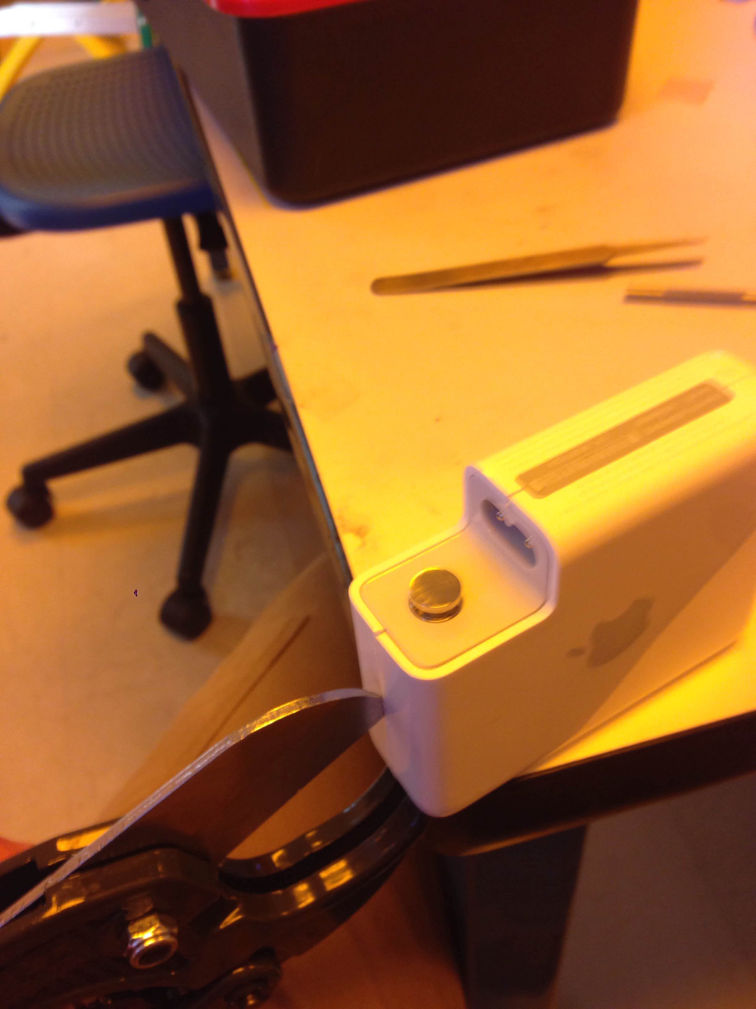 HansDampft has it figured out. So like all of you I had an APE-1264 from ebay that was not acting right. Stuck in a boot loop when plugged in. Would flash green, then solid amber for a while, then off for a moment, flash green once, then back to solid amber. From reading around, it sounded like it was never getting out of its boot cycle. Some forums had some witchdoctor solutions "plug, unplug, 5 mins press reset button, eat salted fish, take a big dump, plug it in again and it will work" kind of stuff. Tried a few but no luck, finally read Hans and a few others saying that they cracked theirs open (no mean feat), but were able to fix it by simply unplugging/replugging a little cable that connected the two halves together. So iFixit has a tutorial on how to get it open, which looks pretty **** hairy (https://www.ifixit.com/Guide/Apple+AirPort+Express+Base+Station+Power+Supply+Kit /7090). I decided that a dremel isn't a good plastic cutting tool, and that I was going to cut it open with a plastic pipe cutting tool, pictured in image 1.