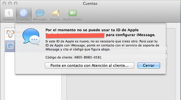 Tengo un problema *** el inicio de iMessage en Mountain Lion, no puedo iniciar sesión *** mi cuenta ID de Apple ni *** cualquier otra, el error que me pone es la que se muestra en la siguiente imagen: